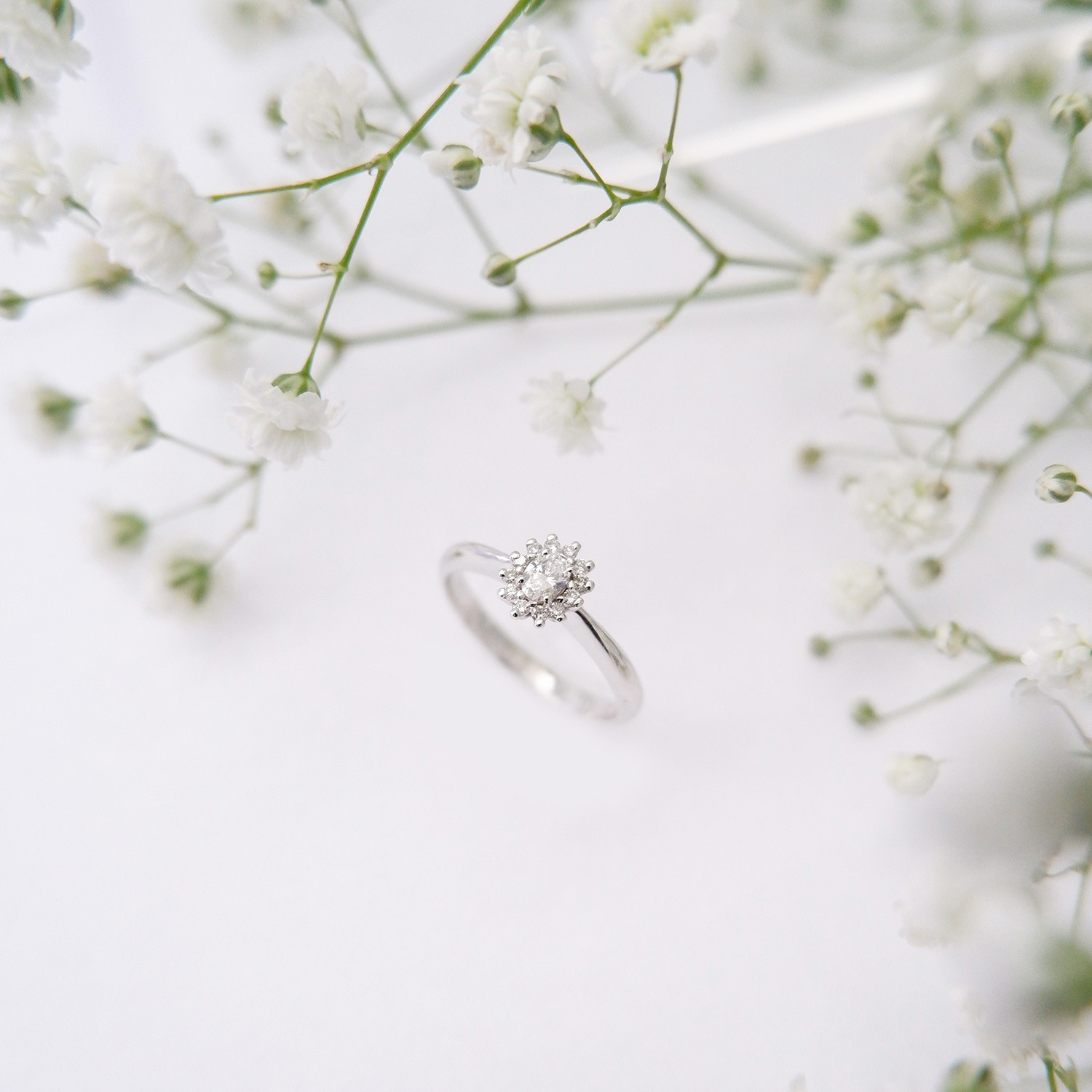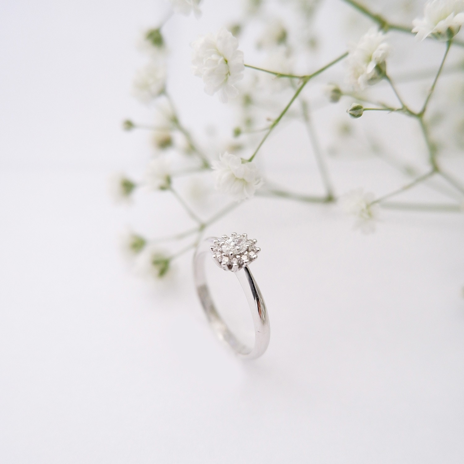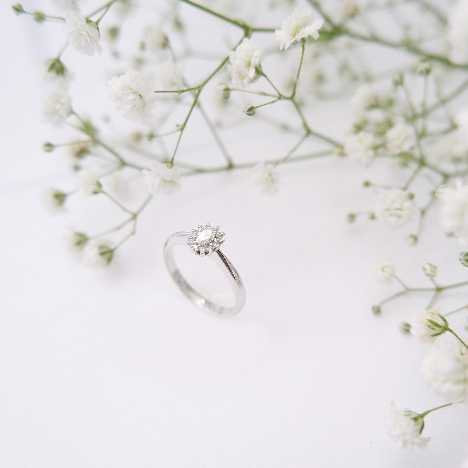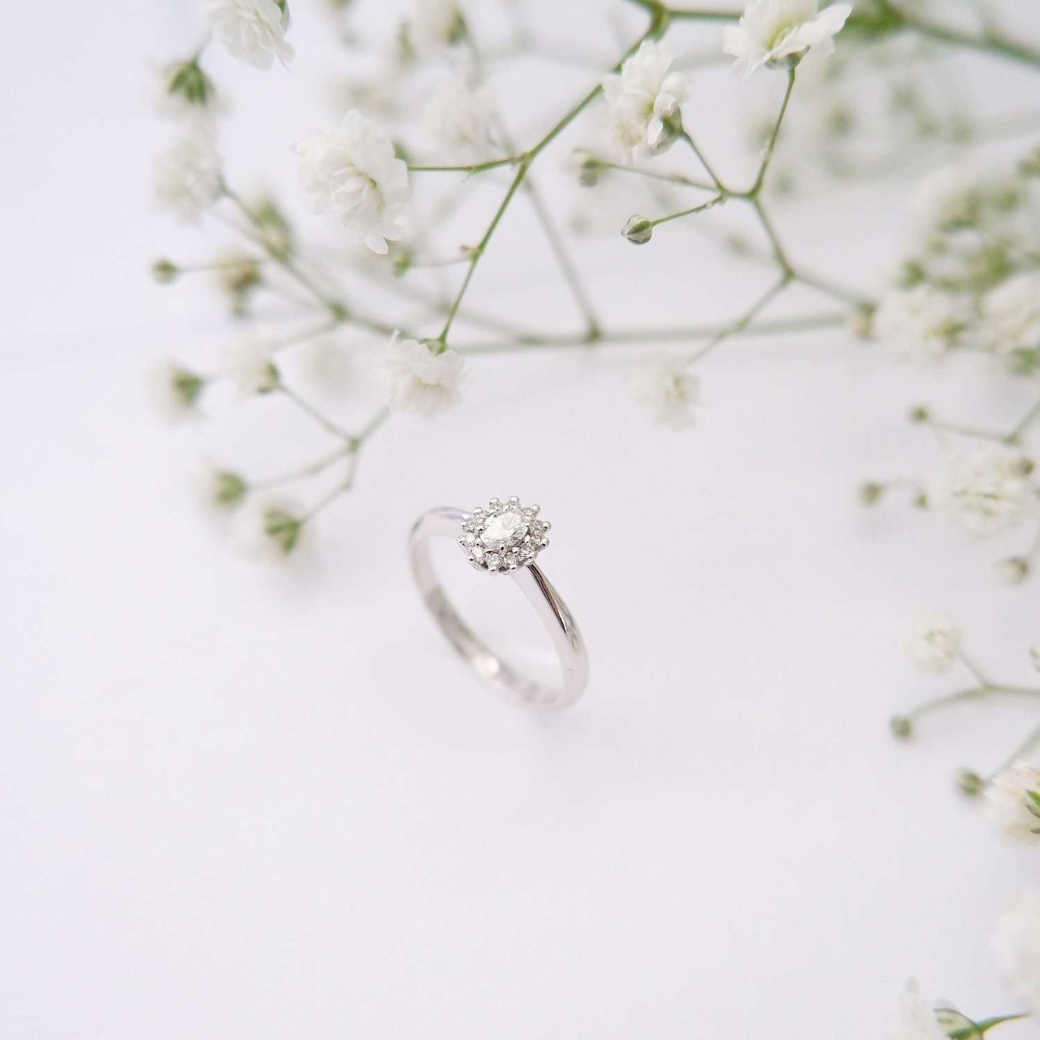 Anello in oro bianco 18kt e diamanti. Diamante centrale taglio Ovale ct 0.15, contorno di diamanti ct 0.10, colore G purezza VS, Oro gr. 3.00.