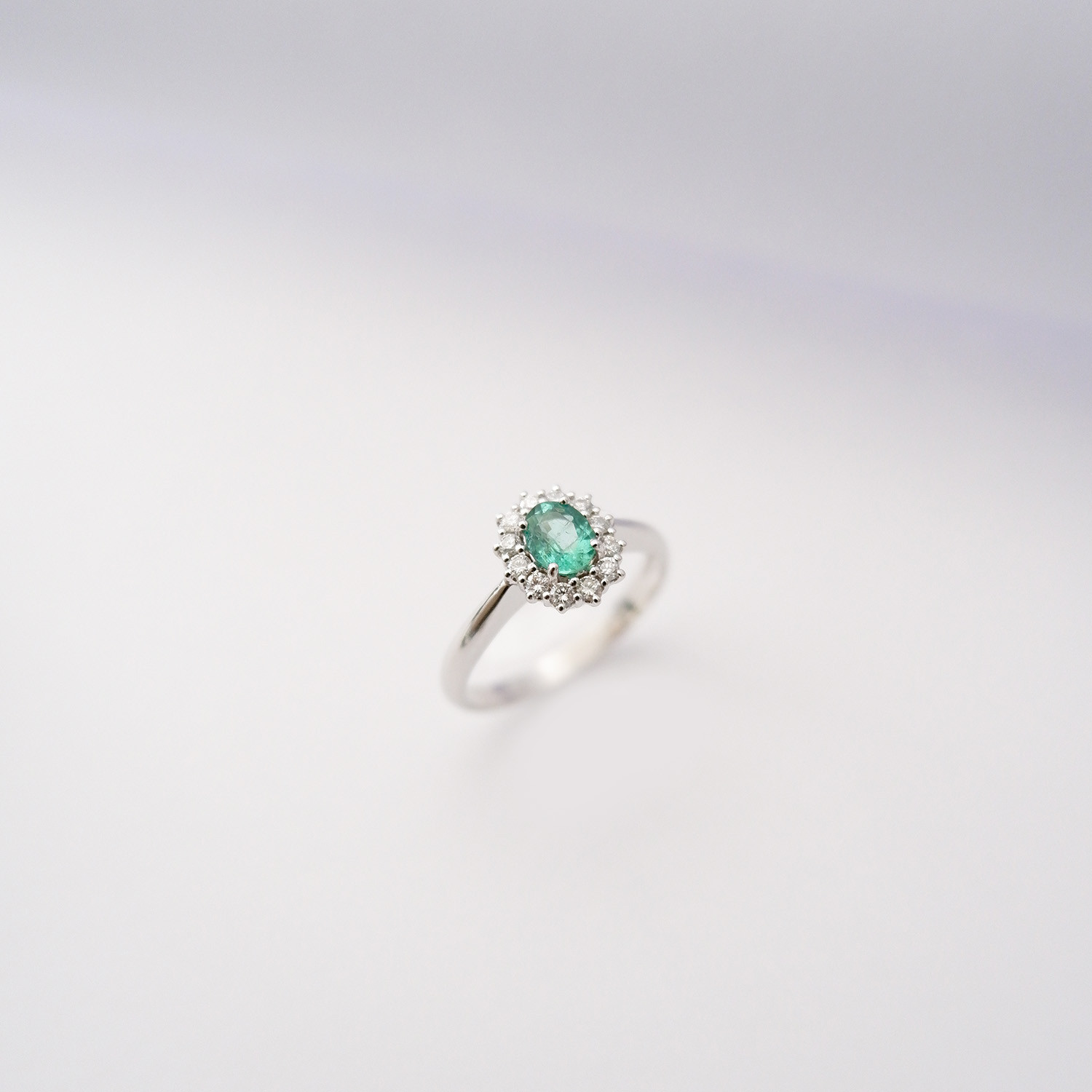Anello in oro bianco 18kt con Smeraldo Naturale mm 5ร4 (ct 0.37), contorno di diamanti ct 0.18, colore G purezza VS2, Oro gr. 3.00.