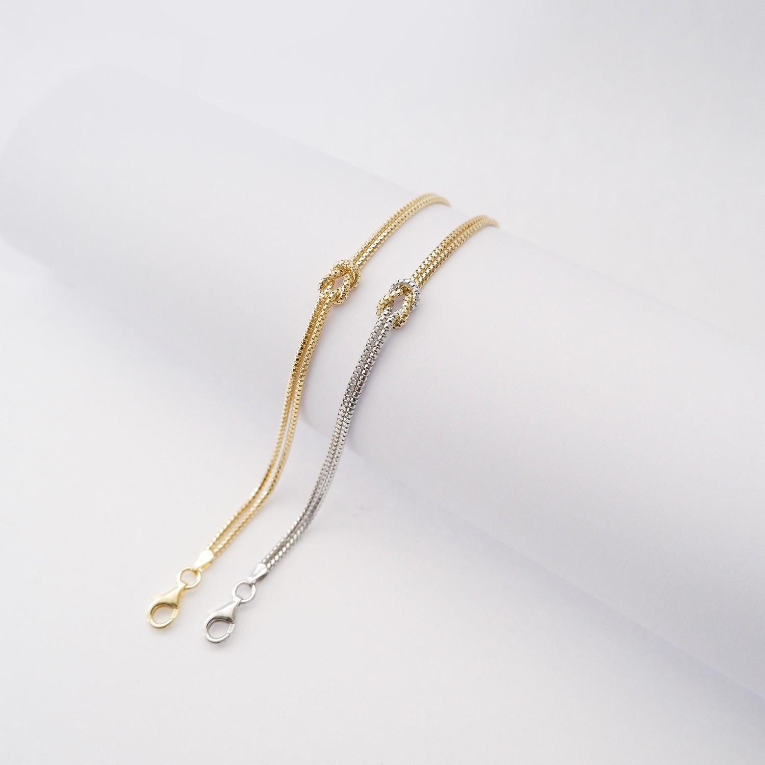Bracciale Nodo in Argento925 con bagno oro giallo o bicolore (rodio bianco e oro giallo) , lunghezza regolabile da 16,5 a 20 cm circa.
