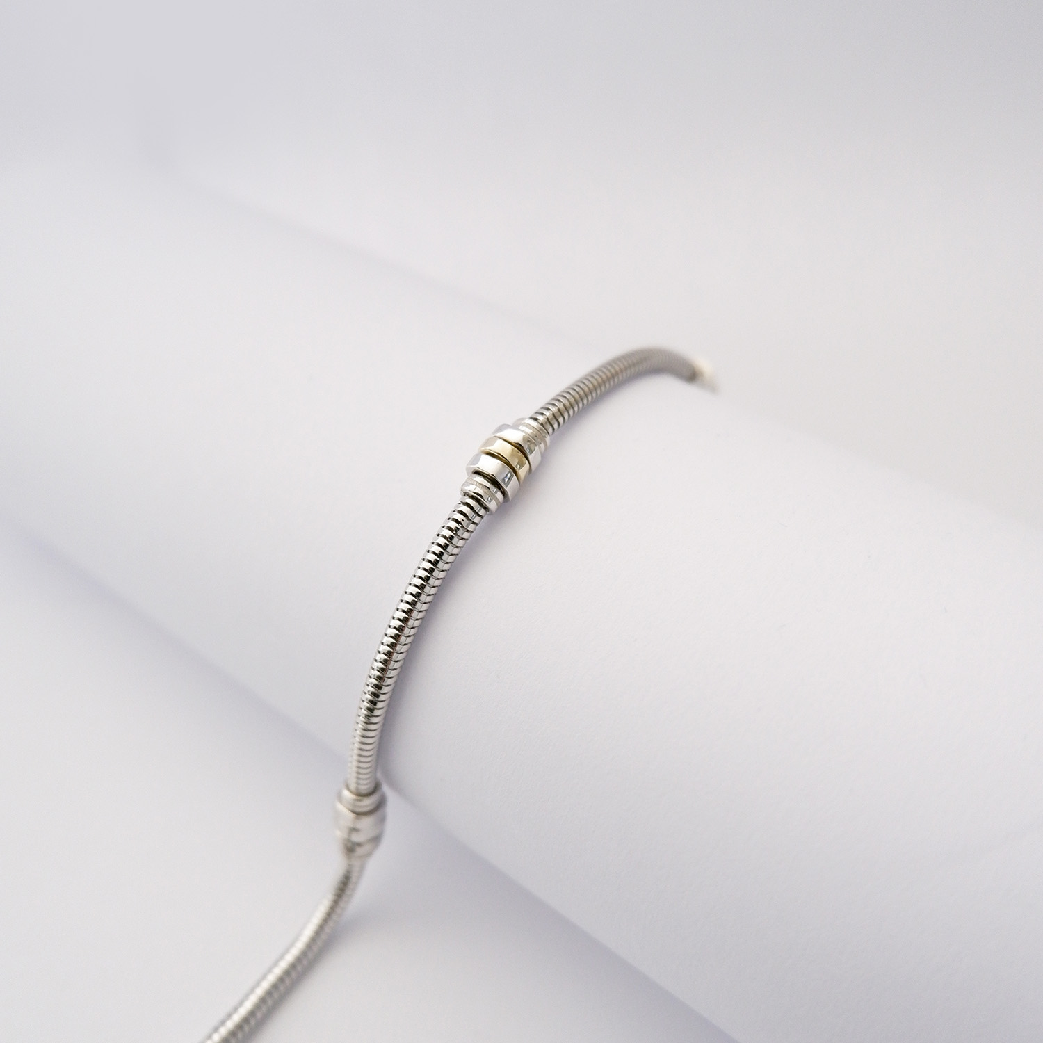 Bracciale Uomo modello Snake tondo in Argento925 rodio bianco con simbolo centrale in Oro 375. Lunghezza regolabile da 18 a 21 cm circa.