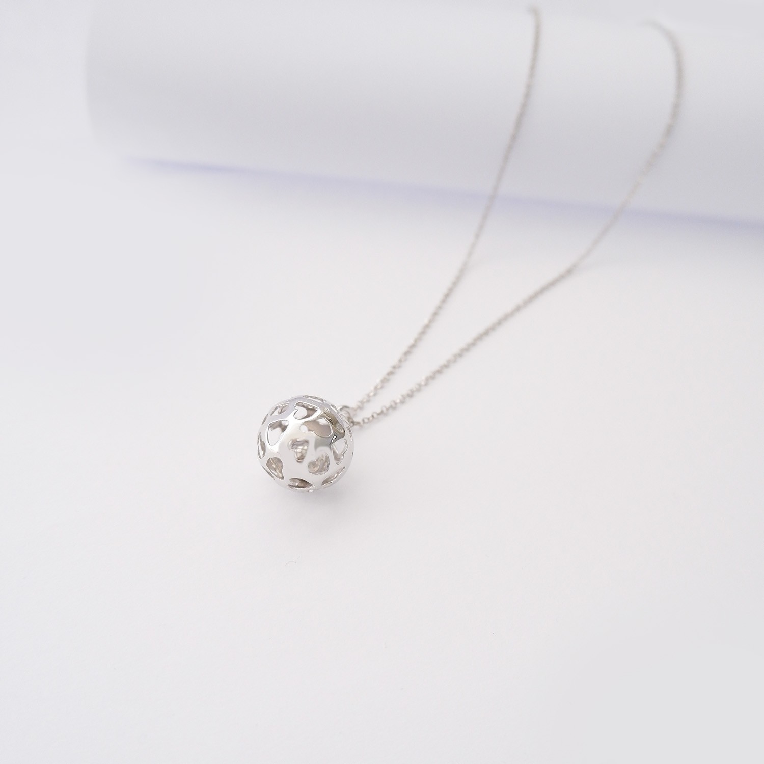 Collana Chiama Angeli con pallina traforata con cuori in argento 925 rodio bianco. Catena rolรฒ lunghezza 80 cm.