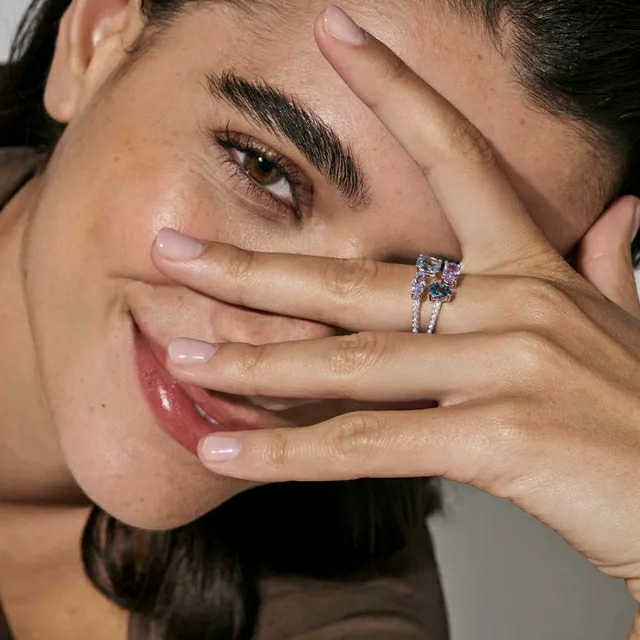 Anello in Argento 925 con rivestimento superficiale in rodio bianco e Cubic Zirconia colorati. Misura regolabile dal numero 15 al 17.