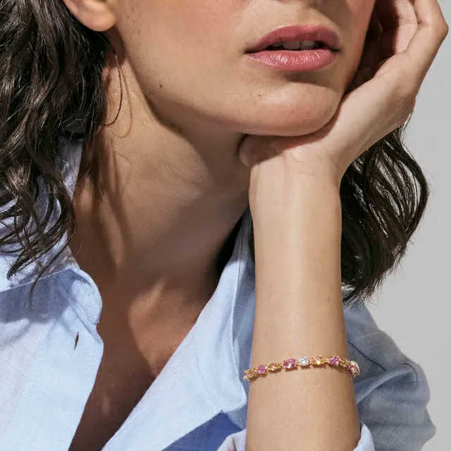 Bracciale in argento 925 con rivestimento superficiale in Oro giallo e Cubic Zirconia colorati. Lunghezza: 20 cm messa a misura fino a 16 cm. Chiusura con Cubic Zirconia.
