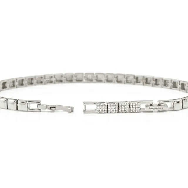 Bracciale in Argento 925 con rivestimento superficiale in rodio bianco e pavè di Cubic Zirconia. Lunghezza regolabile: 21 cm, adattabile fino a 18 cm. Altezza 0,4 cm.