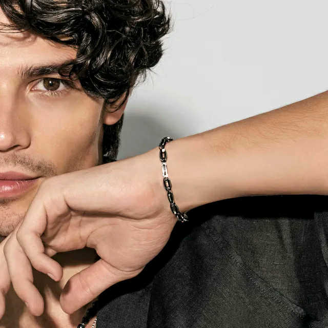 Bracciale in Acciaio 316/304 anallergico con dettagli in PVD nero. Lunghezza regolabile 21 cm adattabile fino a 18 cm. Altezza maglia: 0,35 cm.