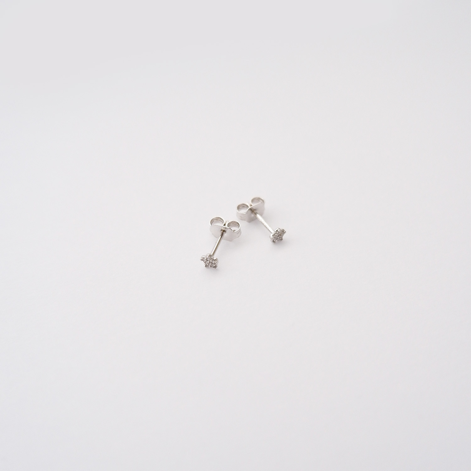 Orecchini mini fiorellino a lobo in oro bianco 18kt e zirconi, chiusura perno e farfalla, dimensioni 0,3 cm.