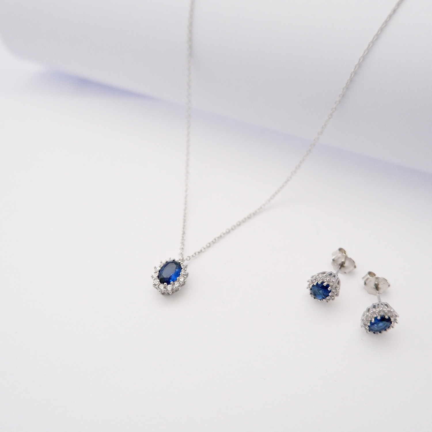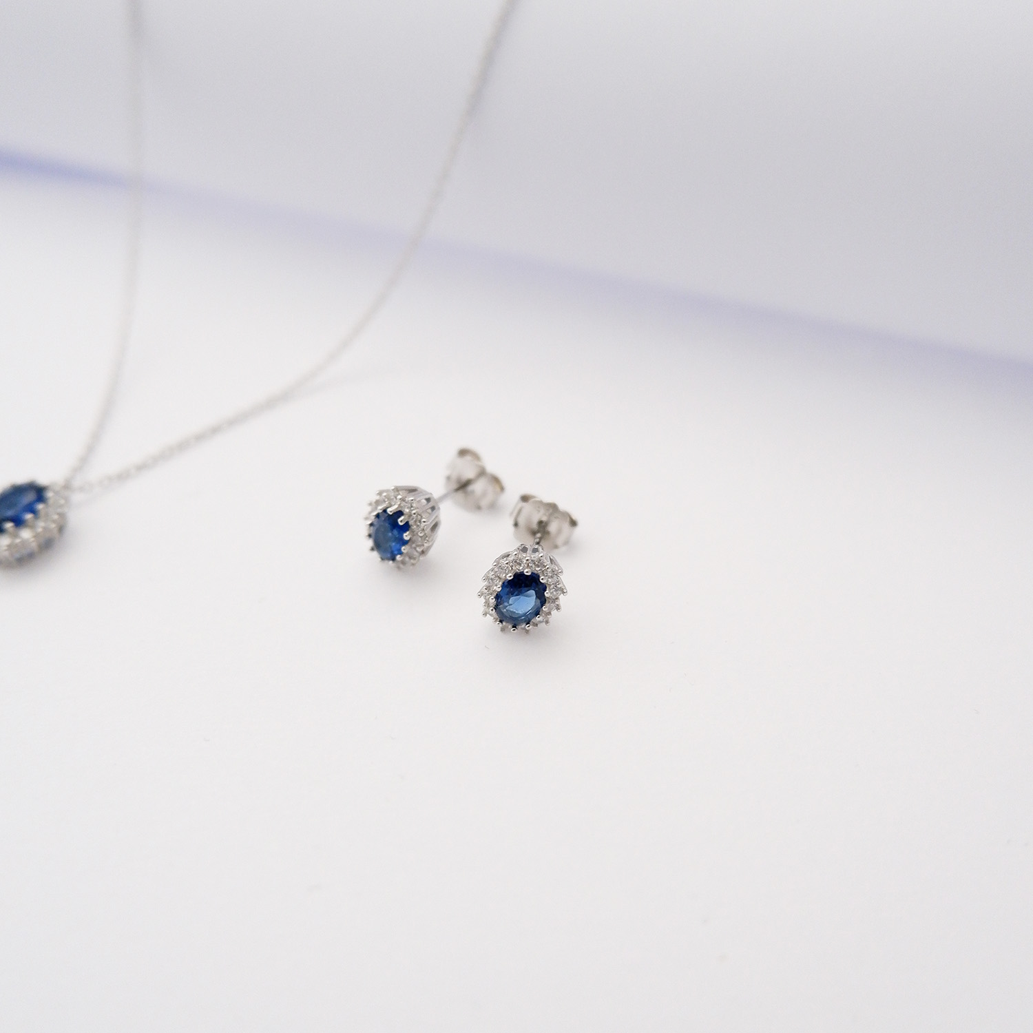 Set Collana e Orecchini Kate Blu in Argento925 bagno rodio bianco e zirconi. Catenina rolรฒ lunghezza regolabile da 38,5 a 43 cm circa. Orecchini chiusura perno e farfalla.