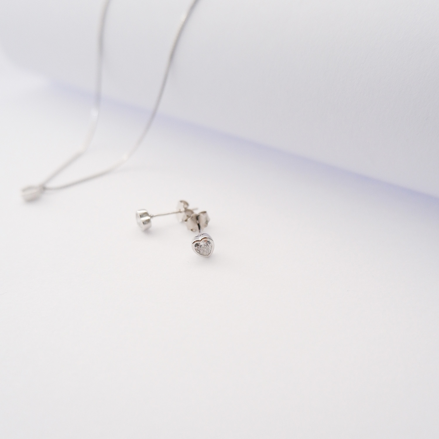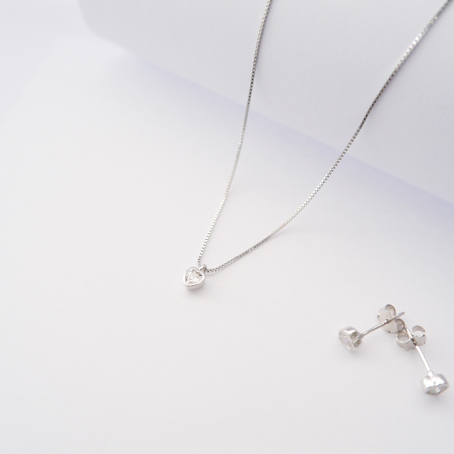 Set Collana e Orecchini in Argento925 bagno rodio bianco e zirconi taglio cuore. Catenina veneziana lunghezza regolabile da 40 a 44 cm circa. Orecchini chiusura perno e farfalla.