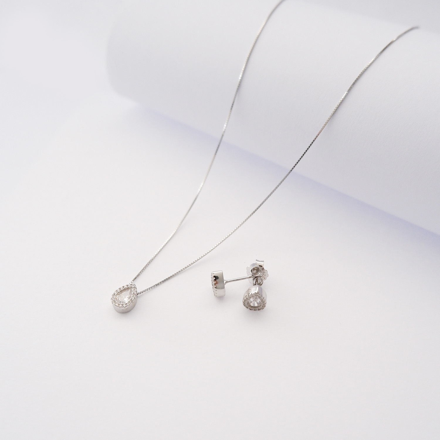 Set Collana e Orecchini Goccia in Argento925 bagno rodio bianco e zirconi . Catenina veneziana lunghezza regolabile da 38 a 43 cm circa. Orecchini chiusura perno e farfalla.