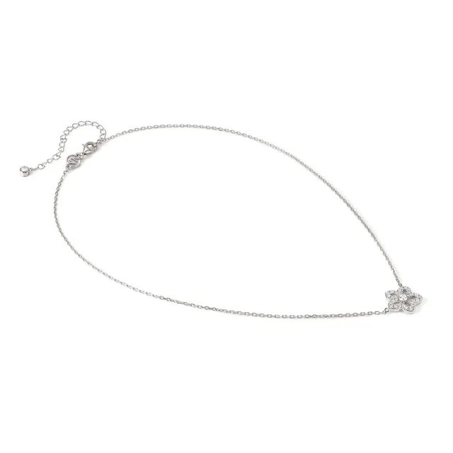 Collana con fiore in argent0 925 e pavè di Cubic Zirconia bianchi, con rivestimento in rodio bianco. Lunghezza collana: 44 cm, adattabile fino a 38 cm. Chiusura con Cubic Zirconia bianco.